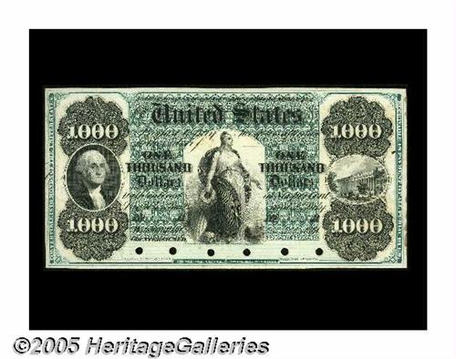 <B>Fr. 202d Hessler X126I (1393b) $1000 1861 Interest Bearing Note Proof Choice New, PC.</B></I> The Ford Collection released another majestic proof back into the collecting community, with this face proof that was printed on light card stock and showing a great deal of embossing. The central vignette of <I>America</B></I> is an all-time favorite, while the green undertint gives off a delightful show of color. There are no issued notes known of this design, while census figures for this face proof rest in the less-than-a-handful category. This proof was once mounted, leaving evidence behind on the back, that has also slightly seeped on to the face along the right-hand edge. Flyspecks of foxing are also noticed, while an errant small black ink mark is found just inside the right-hand edge. Otherwise, this plate letter A proof is free of folds, and it has six small punch cancels along the signature blocks. It was described in the Stack's Ford catalog as a <B>highlight of this memorable offering,</B></I> and we concur.