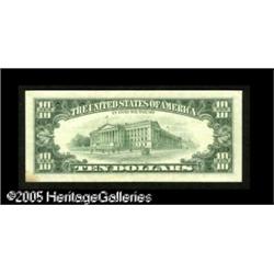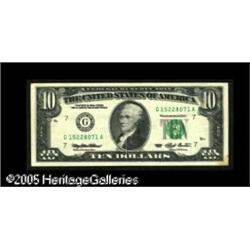 <B>Fr. 2030-G $10 1993 Federal Reserve Note. Very Fine.</B></I><BR>The two face printings are rather widely separated and one of the two is razor sharp, the other one over inked and slightly blurry. The note appears to have never circulated, but it has too many storage folds to allow for a higher grade. There is also a stain in its lower right corner. Lot:15417