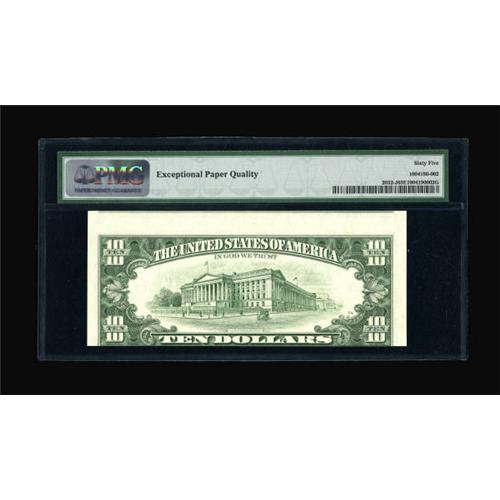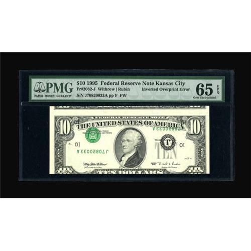 <B>Fr. 2032-J $10 1995 Federal Reserve Note. PMG Gem Uncirculated 65 EPQ.</B></I> A most attractive PMG graded inverted third printing error displaying its associated cutting error as well. <BR><BR><b>Shipping:</b> Coins & Currency (<a target="_blank" href="http://www.heritageauctions.com/common/shipping.php">view shipping information</a>)