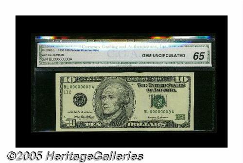 <B>Fr. 2033-L $10 1999 Federal Reserve Note. CGA Gem Uncirculated 65.</B></I><BR>This is the first of a small run of single digit examples, with this being the third $10 of the new Big Head design for the San Francisco district.