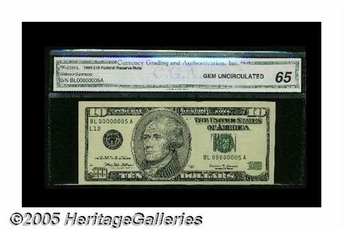 <B>Fr. 2033-L $10 1999 Federal Reserve Note. CGA Gem Uncirculated 65.</B></I><BR>This is a gorgeous $10 that sports serial number 5.
