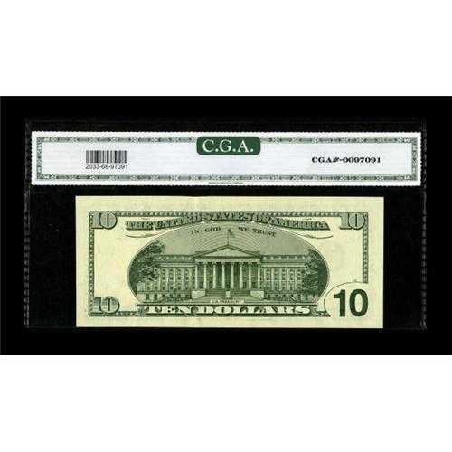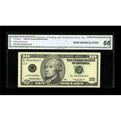 <B>Fr. 2033-L $10 1999 Federal Reserve Note. CGA Gem Uncirculated 66.</B></I><BR> Serial number BL00000010A graces this wonderful Big Head from the first pack of notes printed for San Francisco.<BR><BR><b>Shipping:</b> Coins & Currency (<a target="_blank" href="http://www.heritageauctions.com/common/shipping.php">view shipping information</a>)
