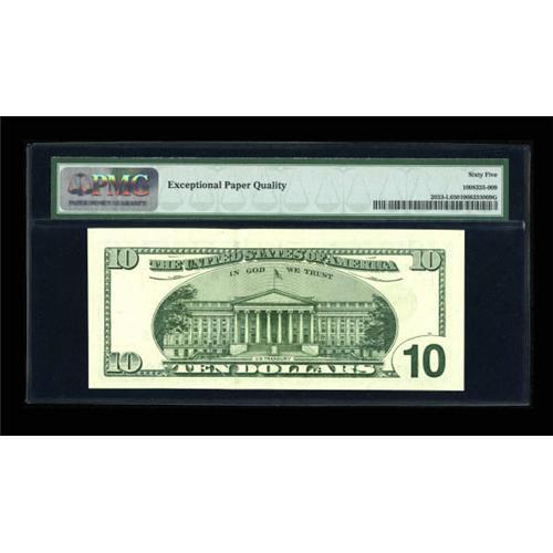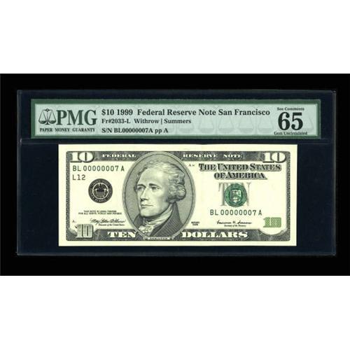 <B>Fr. 2033-L $10 1999 Federal Reserve Note. PMG Gem Uncirculated 65 EPQ.</B></I><BR> Behemoth margins are noted on this Serial Number 7 issue. Low serial numbered notes of the new big-face design are increasing in popularity with each year.<BR><BR><b>Shipping:</b> Coins & Currency (<a target="_blank" href="http://www.heritageauctions.com/common/shipping.php">view shipping information</a>)