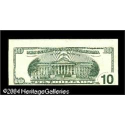 Fr. 2034-F* $10 1999 Federal Reserve Note. Extremely <B>Fr. 2034-F* $10 1999 Federal Reserve Note. Extremely Fine-About Uncirculated.</B></I> This star note is so badly miscut that a small portion of the note above it shows. <BR><BR><B>Important notice:</B> Heritage usually auctions material at the rate of 200-250 lots per hour. On some occasions eBay Live bid software or the Internet may not be able to keep up with the pace of the auction. We recommend placing a realistic absentee bid now as insurance to avoid disappointment. Occasionally the auctioneer may eliminate or reject an eBay Live bid, and the auctioneer may also reopen a lot after the close of the eBay live bidding (usually because we missed an audience bid), and may reject your bid even if it shows you as the winning bidder. By bidding via eBay Live, you agree that Heritage may award the lot to another bidder at its sole discretion under the circumstances described above or any other reasonable circumstances. Since eBay bids are not shown to us until we open the lot on the floor, we treat those bids just like floor bids. In most cases the floor responds before the eBay bid is presented to us, due to Internet lag time, so for consistency we have made it a policy that floor bids are always considered first over tie eBay live bids. Also please note that all Heritage lots purchased through eBay Live carry a 20% Buyer's Premium. Please make sure you read the Terms and Conditions before you bid. This lot is being auctioned in conjunction with a live floor auction by Heritage Galleries & Auctioneers. All final auction and invoice information will be supplied by Heritage Galleries & Auctioneers, and all other information should be considered preliminary. Lot:16124