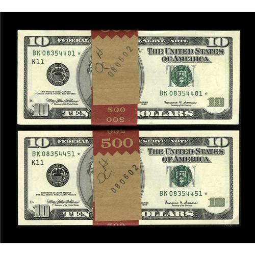 <B>Fr. 2034-K* $10 1999 Federal Reserve Notes. 100 Consecutive Examples. Choice Crisp Uncirculated.</B></I><BR>A corner bump is noticed on the stars of this grouping.<BR><I>From The Rolling Plains Collection</B></I><BR><BR><b>Shipping:</b> Coins & Currency (<a target="_blank" href="http://www.heritageauctions.com/common/shipping.php">view shipping information</a>)
