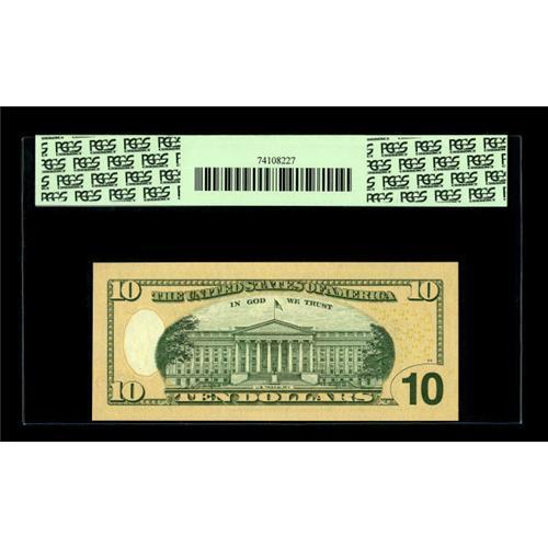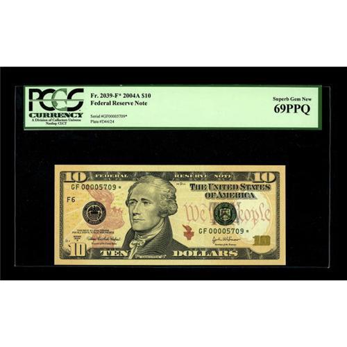 <B>Fr. 2039-F* $10 2004A Federal Reserve Note. PCGS Superb Gem New 69PPQ.</B></I><BR>This may prove to be the first Twenty-first Century rarity. The smallest run ever recorded for replacement notes of 9600 is represented by this exceptionally margined and vibrant $10. Our last auction had one of these graded by a different grading service at a slightly lower grade and it brought over $800 on a $300-$500 estimate.<BR><BR><b>Shipping:</b> Coin/Currency (<a target="_blank" href="http://www.heritageauctions.com/common/shipping.php">view shipping information</a>)