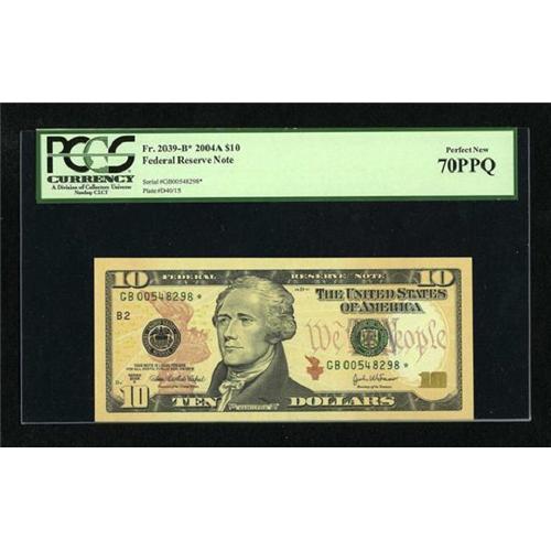 <B>Fr. 2039-B* $10 2004A Federal Reserve Note. PCGS Perfect New 70PPQ.</B></I><BR>No way to improve on this well margined and bright example deemed "perfect."