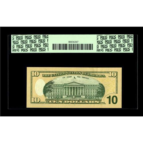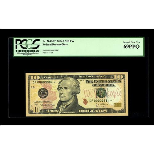 <B>Fr. 2039-F* $10 2004-A Federal Reserve Note. PCGS Superb Gem New 69PPQ.</B></I><BR>This rare recent $10 is broad margined. It is in a holder with an incorrect Friedberg number.<BR><BR><b>Shipping:</b> Coin/Currency (<a target="_blank" href="http://www.heritageauctions.com/common/shipping.php">view shipping information</a>)