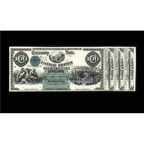 <B>Fr. 204 Hessler 1143 $100 1863 Interest Bearing Note Face Proof With Three Attached Coupons Gem New.</B></I> This Fr. 204 plate letter A face proof is printed on card stock backed with thin card stock. Unlike Hessler 1143, this example is without Treasury officer signatures. Six POCs have also been applied in the signature area, while each of the attached coupons have two POCs through the only signature found on them, Chittenden's. The back center has a paper crease which is not associated with the actual proof, but is found in the backing. This is a stunning beauty with detailed vignettes of <I>Farmer and Mechanics,</B></I> the Treasury Building, and a vignette titled, <I>In the Turret,</B></I> which displays a Civil War naval gun crew preparing to fire. There are only two issued Fr. 204's known, with just one in private hands. We sold that note in our Taylor Family Collection auction in February 2005 for $299,000. This well preserved proof will be a beautiful addition to the next collection it enters, and if you are determined enough, that could be yours.<BR><I>From the California Proof and Specimen Collection.</B></I>