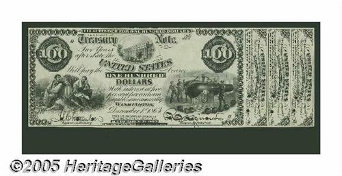 <B>Fr. 204 Hessler X138D (1143) $100 1863 Interest Bearing Note Proof With Three Attached Coupons Choice New, PC.</B></I> This illustrious proof was last auctioned at Memphis 2000. This Fr. 204 proof is uniface and printed on heavily silk fibered paper. Six punch cancels have been applied through the signatures of Chittenden and Spinner, while each of the attached coupons has two punch cancels through the only signature found on them, Chittenden's. The right-hand edge reveals a trivial edge crimp, while the back right-hand side exhibits a minor defect in the paper. A stunning beauty with detailed vignettes of <I>Farmer and Mechanics,</B></I> the Treasury Building, and a vignette titled, <I>In the Turret,</B></I> which displays a Civil War naval gun crew getting ready to fire. There are only two issued Fr. 204's known, with just one in private hands. We sold that note in our Taylor Family Collection auction in February for $299,000. This proof will invite you in for a lot less than that.