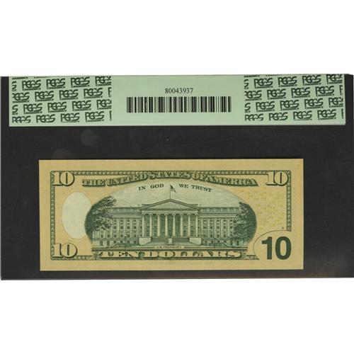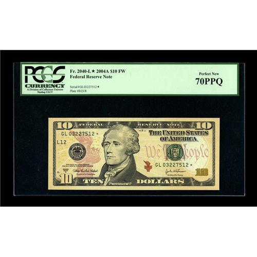 <B>Fr. 2040-L* $10 2004A Federal Reserve Note. PCGS Superb Gem New 70PPQ.</B></I><BR>The third party grade is the ideal description for all of this note's attributes. The margins are perfect, the printing is perfect, and the paper quality is perfect. PCGS has incorrectly identified the Friedberg number on the holder.<BR><BR><b>Shipping:</b> Coins & Currency (<a target="_blank" href="http://www.heritageauctions.com/common/shipping.php">view shipping information</a>)