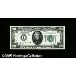 <B>Fr. 2050-A* $20 1928 Federal Reserve Note. About Uncirculated.</B></I><BR>One of the scarcest districts for stars in this series. This piece has been graded as CU in the past, and will no doubt be graded that way in the future, but we will opt for the more conservative approach here, as the amount of handling is just too excessive for any higher designation. Lot:16081