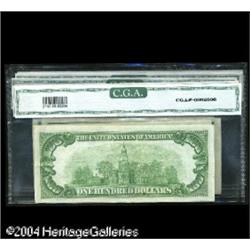 Fr. 2050-A $20 1928 Federal Reserve Note. Gem Crisp Unc <B>Five Lightly Handled CGA Notes.</B></I><BR>San Francisco, CA</B></I> - $5 1929 Ty. 2 Crocker First NB Ch. # 1741 CGA About Uncirculated 50<BR>Fr. 1951-A (Mis-labeled Insert) $5 1928A Federal Reserve Note. CGA Extremely Fine 45<BR>Fr. 1952-K $5 1928B Federal Reserve Note. CGA Extremely Fine 40<BR>Fr. 2050-A $20 1928 Federal Reserve Note. CGA Extremely Fine 40<BR>Fr. 2150-I $100 1928 Federal Reserve Note. CGA About Uncirculated 50.<BR>The Minneapolis $100 is the scarcest for the series, with this example having a single lateral fold. This keeps it from the Oakes price tag of $2500.<BR> 5 notes <BR><BR><B>Important notice:</B> Heritage usually auctions material at the rate of 200-250 lots per hour. On some occasions eBay Live bid software or the Internet may not be able to keep up with the pace of the auction. We recommend placing a realistic absentee bid now as insurance to avoid disappointment. Occasionally the auctioneer may eliminate or reject an eBay Live bid, and the auctioneer may also reopen a lot after the close of the eBay live bidding (usually because we missed an audience bid), and may reject your bid even if it shows you as the winning bidder. By bidding via eBay Live, you agree that Heritage may award the lot to another bidder at its sole discretion under the circumstances described above or any other reasonable circumstances. Since eBay bids are not shown to us until we open the lot on the floor, we treat those bids just like floor bids. In most cases the floor responds before the eBay bid is presented to us, due to Internet lag time, so for consistency we have made it a policy that floor bids are always considered first over tie eBay live bids. Also please note that all Heritage lots purchased through eBay Live carry a 20% Buyer's Premium. Please make sure you read the Terms and Conditions before you bid. This lot is being auctioned in conjunction with a live floor auction by Heritage Galleries & Auctioneers. All final auction and invoice information will be supplied by Heritage Galleries & Auctioneers, and all other information should be considered preliminary. Lot:16608