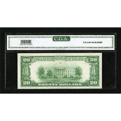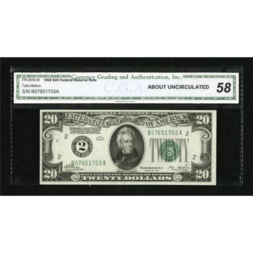 <B>Fr. 2050-B $20 1928 Federal Reserve Note. CGA About Uncirculated 58.</B></I><BR> This is a bright example of the ever popular redeemable in gold issue with numeric designator.<BR><BR><b>Shipping:</b> Coins & Currency (<a target="_blank" href="http://www.heritageauctions.com/common/shipping.php">view shipping information</a>)