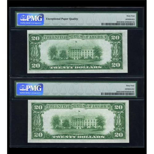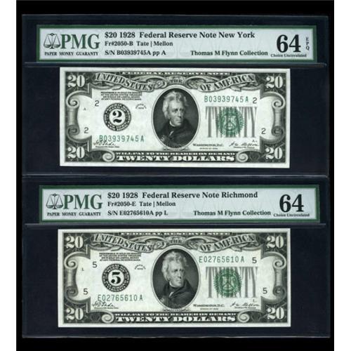 <B>Fr. 2050-B $20 1928 Federal Reserve Note. PMG Choice Uncirculated 64 EPQ; Fr. 2050-E $20 1928 Federal Reserve Note. PMG Choice Uncirculated 64.</B></I><BR> Bright overprints and nice embossing are readily apparent on this pair of early $20 Feds that have been encapsulated by PMG.<BR><I>From The Thomas M. Flynn Collection</B></I><BR><BR><b>Shipping:</b> Coins & Currency (<a target="_blank" href="http://www.heritageauctions.com/common/shipping.php">view shipping information</a>)