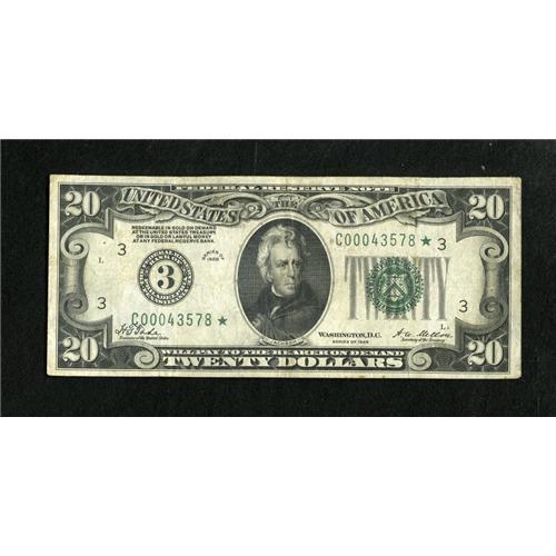 <B>Fr. 2050-C* $20 1928 Federal Reserve Note. Fine-Very Fine.</B></I><BR>This is a difficult replacement note to acquire based on how few we have seen at past auctions.<BR><BR><b>Shipping:</b> Coins & Currency (<a target="_blank" href="http://www.heritageauctions.com/common/shipping.php">view shipping information</a>)