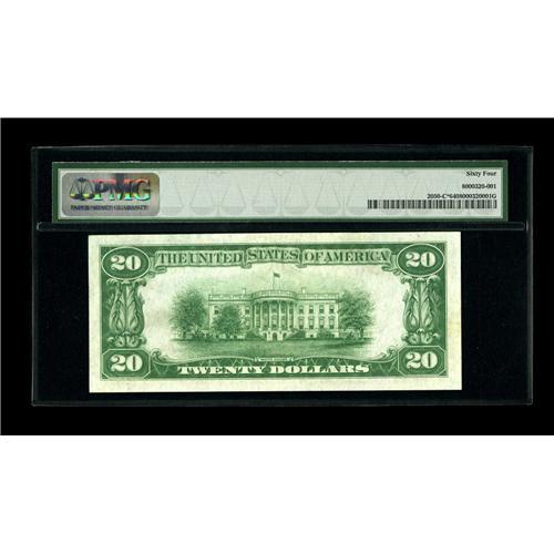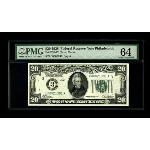 <B>Fr. 2050-C* $20 1928 Federal Reserve Note. PMG Choice Uncirculated 64.</B></I><BR>All of these numbered district stars are quite scarce in any grade but certainly in the upper reaches of the grading scale. Expect the Oakes value of $2,000 to be surpassed in the opening moments of bidding.<BR><BR><b>Shipping:</b> Coin/Currency (<a target="_blank" href="http://www.heritageauctions.com/common/shipping.php">view shipping information</a>)