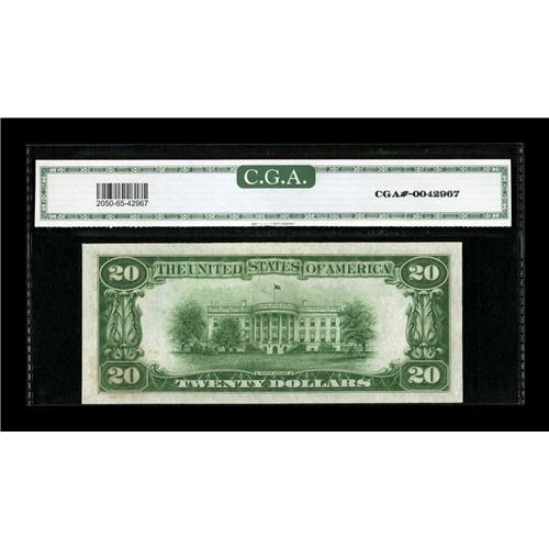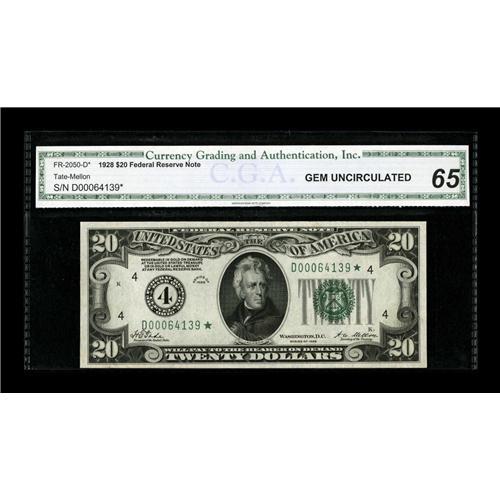 <B>Fr. 2050-D* $20 1928 Federal Reserve Note. CGA Gem Uncirculated 65.</B></I><BR>A very scarce example of a numbered district star that appears to be a bright and colorful example with excellent margins for the type. A couple of toning spots are noticed on the back for accuracy's sake.<BR><BR><b>Shipping:</b> Coin/Currency (<a target="_blank" href="http://www.heritageauctions.com/common/shipping.php">view shipping information</a>)