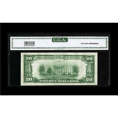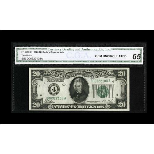 <B>Fr. 2050-D $20 1928 Federal Reserve Note. CGA Gem Uncirculated 65.</B></I><BR>The crisply impressed embossing on this original Gem will please even the fussiest buyer.