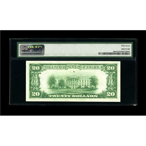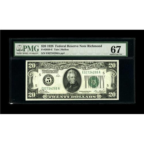 <B>Fr. 2050-E $20 1928 Federal Reserve Note. PMG Superb Gem Unc 67.</B></I><BR>An enormously margined example of the Richmond district which has forest green ink colors and exceptional eye appeal.<BR><BR><b>Shipping:</b> Coin/Currency (<a target="_blank" href="http://www.heritageauctions.com/common/shipping.php">view shipping information</a>)