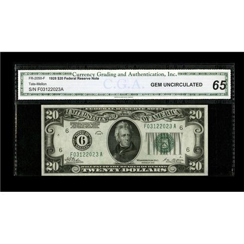 <B>Fr. 2050-F $20 1928 Federal Reserve Note. CGA Gem Uncirculated 65.</B></I><BR>Almost perfect margins and deep, green color are noted on this Gem.<BR><BR><b>Shipping:</b> Coin/Currency (<a target="_blank" href="http://www.heritageauctions.com/common/shipping.php">view shipping information</a>)