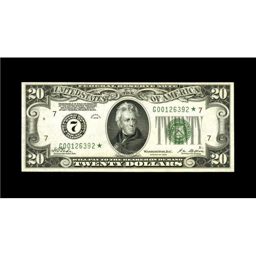 <B>Fr. 2050-G* $20 1928 Federal Reserve Note. Choice Crisp Uncirculated.</B></I><BR>This is a very popular series with star note collectors. In this state of preservation the demand can only be characterized as frenzied when stars do appear on the marketplace. Bid accordingly if you wish to avoid the disappointment of seeing another collector triumph in the battle for this prize tonight.<BR><I>From The Bill and Kathy Stella Currency Collection</B></I><BR><BR><b>Shipping:</b> Coin/Currency (<a target="_blank" href="http://www.heritageauctions.com/common/shipping.php">view shipping information</a>)