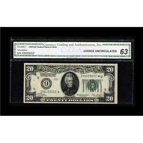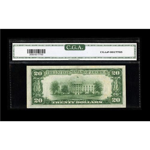 <B>Fr. 2050-I* $20 1928 Federal Reserve Note. CGA Choice Uncirculated 63.</B></I><BR>A little bit of aging is seen in the top margin. We sold a non-third party graded example in a lower grade in February 2005 for almost $1000.<BR><BR><b>Shipping:</b> Coin/Currency (<a target="_blank" href="http://www.heritageauctions.com/common/shipping.php">view shipping information</a>)