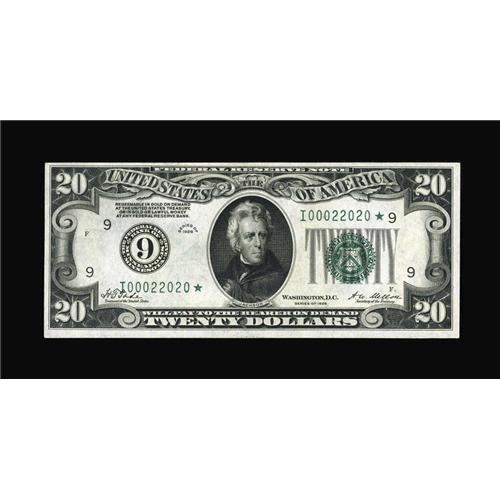 <B>Fr. 2050-I* $20 1928 Federal Reserve Note. Very Choice Crisp Uncirculated.</B></I><BR>A very rare star note in any grade, and exceptionally rare this nice. The centering is not perfect, and there is a touch of light handling, but this important star rarity is clearly destined for a major holding. We previously called this note Gem in our 2004 Long Beach sale, however in today's market a more accurate representation would be Very Choice.<BR><BR><b>Shipping:</b> Coins & Currency (<a target="_blank" href="http://www.heritageauctions.com/common/shipping.php">view shipping information</a>)