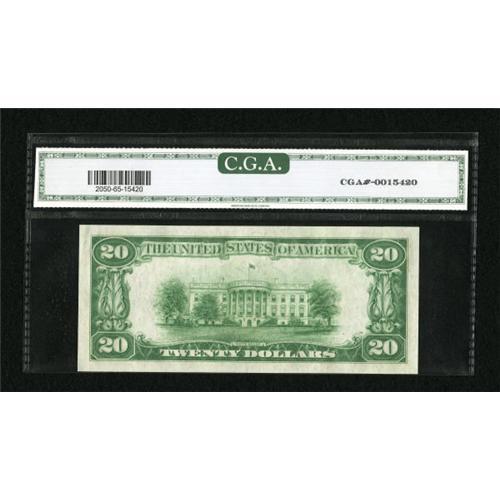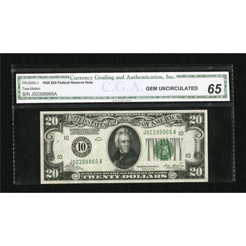 <B>Fr. 2050-J $20 1928 Federal Reserve Note. CGA Gem Uncirculated 65.</B></I><BR> This Kansas City $20 appears to be a wonderfully embossed and perfectly centered numbered district note.<BR><BR><b>Shipping:</b> Coins & Currency (<a target="_blank" href="http://www.heritageauctions.com/common/shipping.php">view shipping information</a>)