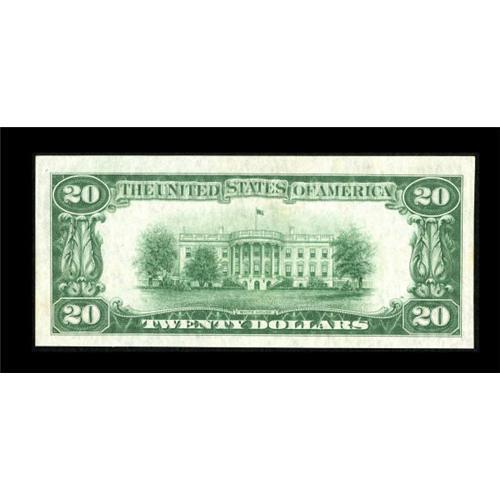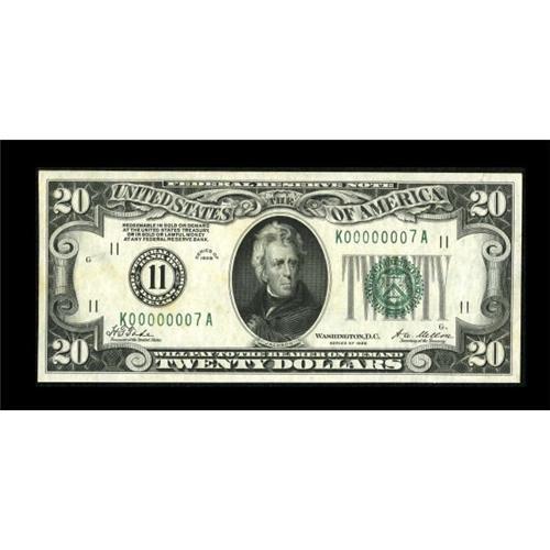<B>Fr. 2050-K $20 1928 Federal Reserve Note. Choice Crisp Uncirculated.</B></I><BR> From an uncut strip of three consecutive examples sold by us some time ago. This note is very original with plenty of serial number embossing present. Some unimportant staining affects nothing and the eye appeal of this low serial number beauty is great. This note becomes the lowest serial number known in the Schwartz tome.<BR><BR><b>Shipping:</b> Coins & Currency (<a target="_blank" href="http://www.heritageauctions.com/common/shipping.php">view shipping information</a>)