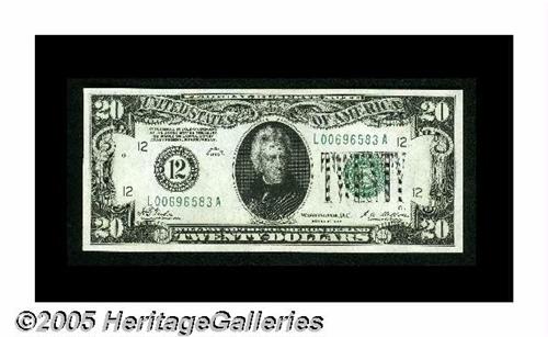<B>Fr. 2050-L $20 1928 Federal Reserve Note. Gem Crisp Uncirculated.</B></I><BR>A crackling-fresh and fully embossed beauty with near-perfect centering, making this piece an outstanding type example.