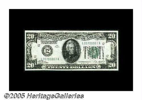 <B>Fr. 2050-L $20 1928 Federal Reserve Note. Gem Crisp Uncirculated.</B></I><BR>A pristine Gem from a the earliest Federal Reserve Note series that seems to entertain no limitations to its popularity with the collecting fraternity. The bright paper surfaces and dark green treasury seal and serial make for a simply stunning appearance on this issue. With the pack fresh and original paper of tonight's example, we expect to see an especially strong realization.