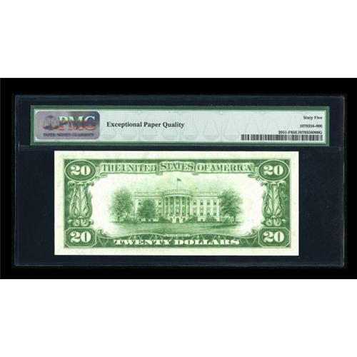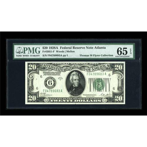 <B>Fr. 2051-F $20 1928A Federal Reserve Note. PMG Gem Uncirculated 65 EPQ.</B></I><BR> The Atlanta district is one of the more easily found in top grade, as a small group of these notes came out several years ago in an Alabama cash hoard, although PMG has graded only one piece higher than 65 to date.<BR><I>From The Thomas M. Flynn Collection</B></I><BR><BR><b>Shipping:</b> Coins & Currency (<a target="_blank" href="http://www.heritageauctions.com/common/shipping.php">view shipping information</a>)