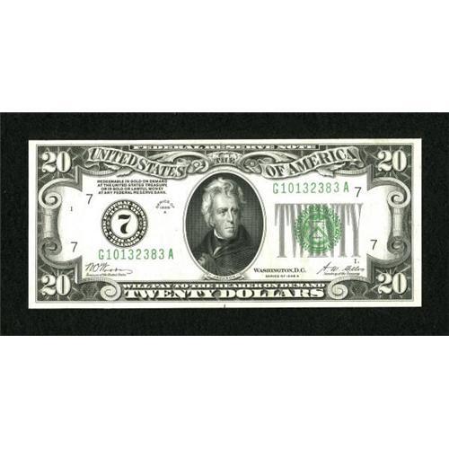 <B>Fr. 2051-G $20 1928A Federal Reserve Note. Choice About Uncirculated.</B></I><BR> A light center fold is noticed on this extremely bright, well embossed $20 FRN.<BR><BR><b>Shipping:</b> Coins & Currency (<a target="_blank" href="http://www.heritageauctions.com/common/shipping.php">view shipping information</a>)