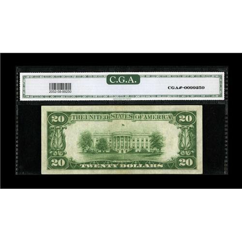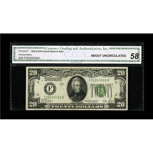 <B>Fr. 2052-F $20 1928B Federal Reserve Note. CGA About Uncirculated 58.</B></I><BR>Close inspection reveals a light center fold and a couple of corner tip folds.<BR><BR><b>Shipping:</b> Coin/Currency (<a target="_blank" href="http://www.heritageauctions.com/common/shipping.php">view shipping information</a>)