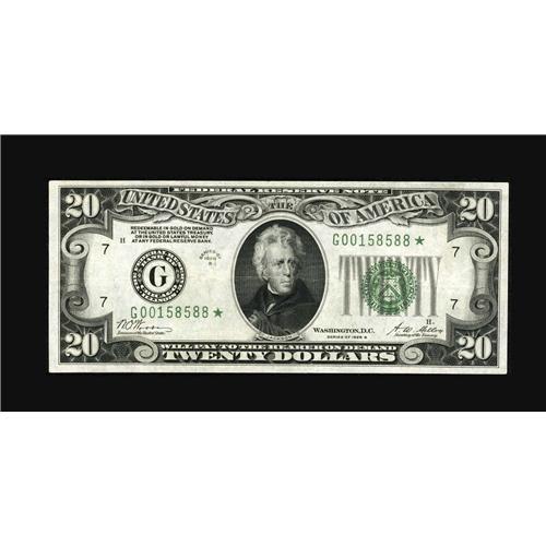 <B>Fr. 2052-G* $20 1928B Federal Reserve Note. Fine.</B></I><BR>This mid-grade Star has the appearance of a higher grade.<BR><I>From The Bill and Kathy Stella Currency Collection</B></I><BR><BR><b>Shipping:</b> Coin/Currency (<a target="_blank" href="http://www.heritageauctions.com/common/shipping.php">view shipping information</a>)
