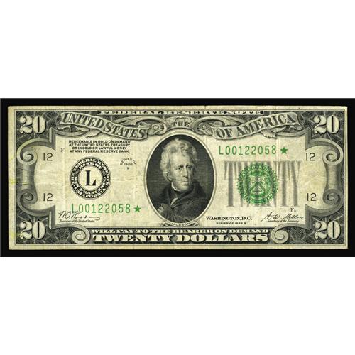 <B>Fr. 2052-L* $20 1928B Federal Reserve Note. Very Fine.</B></I><BR>A very elusive early star in a presentable middle circulated grade.