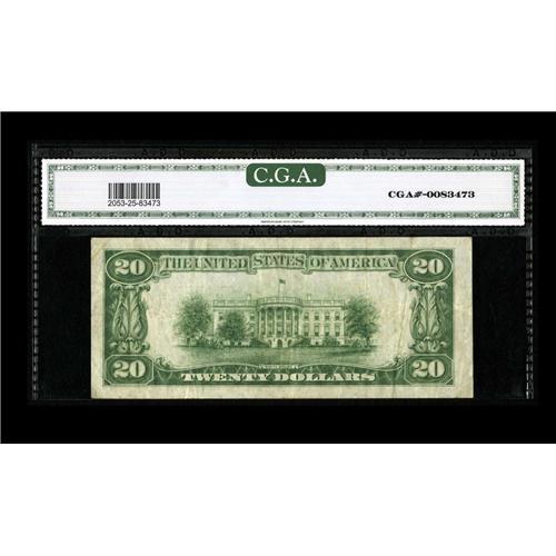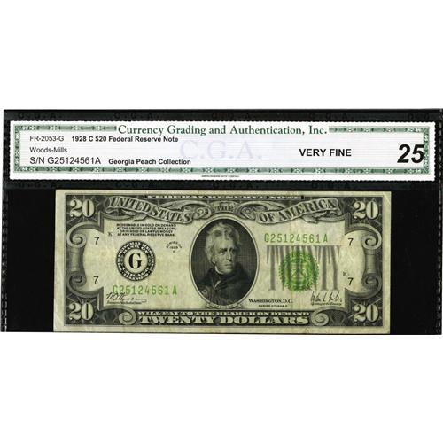 <B>Fr. 2053-G $20 1928C Federal Reserve Note. CGA Very Fine 25.</B></I><BR>This is a very nice example of this scarcer series with the margins on this note being rather broad and the ink colors particularly bright. In today's environment of third party graded notes this one should fit the bill for someone's collection as it appears to have very good paper quality.