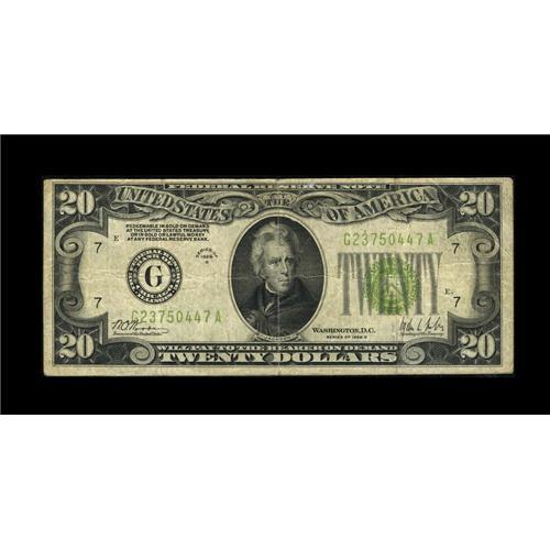 <B>Fr. 2053-G $20 1928C Federal Reserve Note. Fine.</B></I><BR>This is a classic Small Size rarity that came out of the depths of the Great Depression. Chicago and San Francisco were the only two districts to issue this series and denomination. This example displays uniform circulation and a small pencil mark on the back.<BR><BR><b>Shipping:</b> Coins & Currency (<a target="_blank" href="http://www.heritageauctions.com/common/shipping.php">view shipping information</a>)