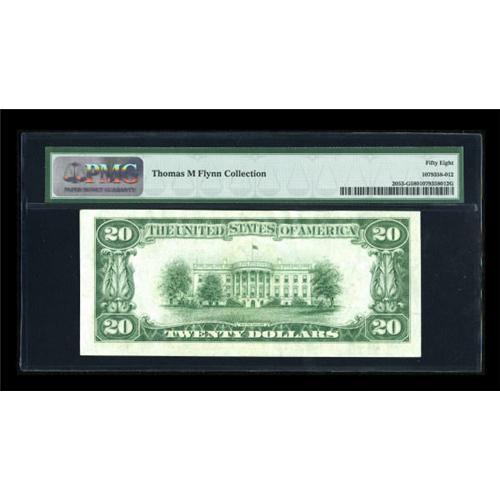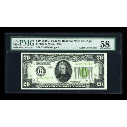 <B>Fr. 2053-G $20 1928C Light Green Seal Federal Reserve Note. PMG Choice About Unc 58.</B></I><BR> The 1928C notes were issued only from the Chicago and San Francisco districts, with the latter being the scarcer. High grade Chicago examples are truly scarce, with this the highest grade of the ten examples PMG has examined, the next highest being a lone EF 40. <BR><I>From The Thomas M. Flynn Collection</B></I><BR><BR><b>Shipping:</b> Coins & Currency (<a target="_blank" href="http://www.heritageauctions.com/common/shipping.php">view shipping information</a>)