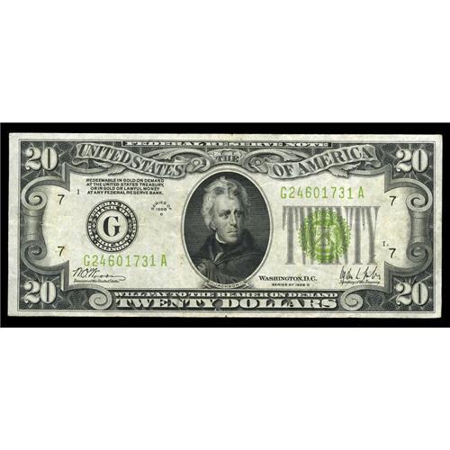 <B>Fr. 2053-G $20 1928C Federal Reserve Note. Very Fine.</B></I><BR>This is scarce series with this Chicago $20 exhibiting a few pinholes.