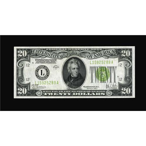<B>Fr. 2053-L $20 1928C Federal Reserve Note. Choice Crisp Uncirculated.</B></I><BR>From our 2005 Dallas sale, "The San Francisco district is by far the scarcer of the pair which issued, and this piece is by a considerable margin the finest 1928C $20 we've had the privilege of offering. It's bright and exceptionally well centered, truly a note worthy of a place in any fine collection of small size currency." To this day, we have yet to handle a nicer example from SFO.<BR><BR><b>Shipping:</b> Coins & Currency (<a target="_blank" href="http://www.heritageauctions.com/common/shipping.php">view shipping information</a>)