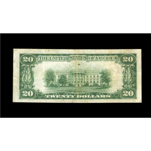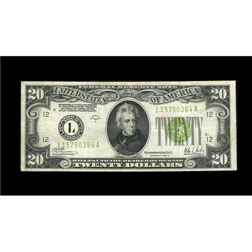 <B>Fr. 2053-L $20 1928C Federal Reserve Note. Fine-Very Fine.</B></I><BR>Another example of this scarcer issue with the eye catching seal color. Solid margins encase lightly circulated surfaces which are still bright.