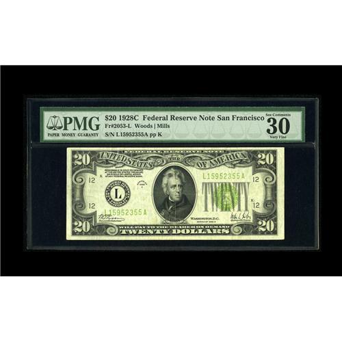 <B>Fr. 2053-L $20 1928C Federal Reserve Note. PMG Very Fine 30 EPQ.</B></I><BR>Many dealers and even some collectors would call this piece EF. The paper is solid and pleasing for this key.<BR><BR><b>Shipping:</b> Coin/Currency (<a target="_blank" href="http://www.heritageauctions.com/common/shipping.php">view shipping information</a>)