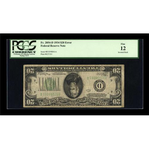 <B>Fr. 2054-D $20 1934 Federal Reserve Note. PCGS Fine 12.</B></I><BR> This Cleveland green seal is offered in one of our auctions for the first time. This note circulated for a long while before the error was discovered.<BR><I>From The Amelia Island Collection.</B></I><BR><BR><b>Shipping:</b> Coins & Currency (<a target="_blank" href="http://www.heritageauctions.com/common/shipping.php">view shipping information</a>)