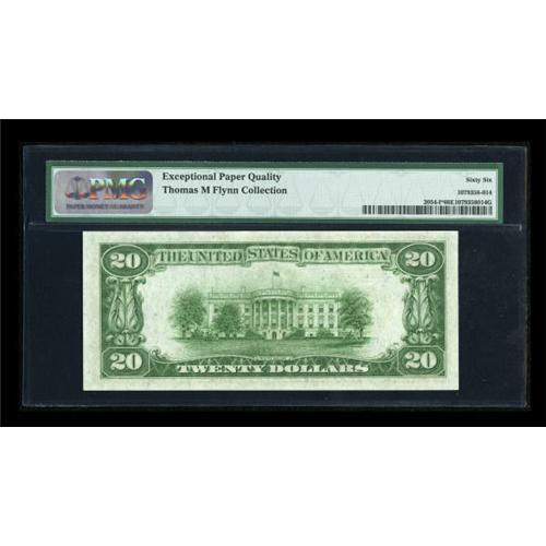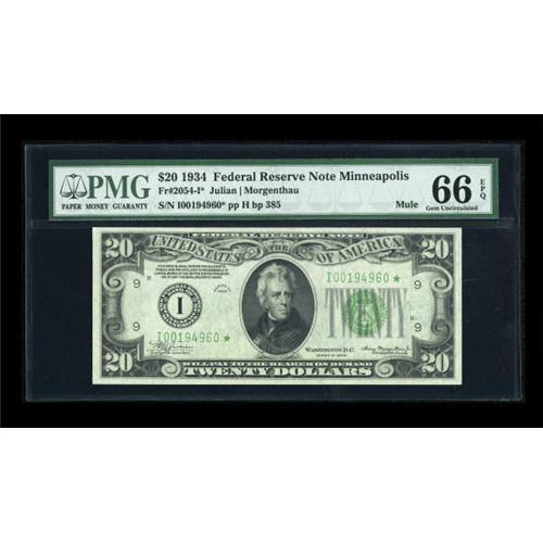 <B>Fr. 2054-I* $20 1934 Mule Federal Reserve Note. PMG Gem Uncirculated 66 EPQ.</B></I><BR> A beautiful example of the tough Minneapolis star, with great centering and total originality. <BR><I>From The Thomas M. Flynn Collection</B></I><BR><BR><b>Shipping:</b> Coins & Currency (<a target="_blank" href="http://www.heritageauctions.com/common/shipping.php">view shipping information</a>)