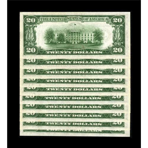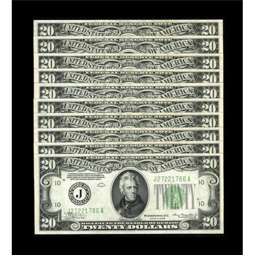 <B>Fr. 2054-J $20 1934 Mule Federal Reserve Notes. Ten Consecutive Examples. Very Choice Crisp Uncirculated.</B></I><BR> A few Gems are noticed in this pleasing Kansas City group.<BR><BR><b>Shipping:</b> Coins & Currency (<a target="_blank" href="http://www.heritageauctions.com/common/shipping.php">view shipping information</a>)