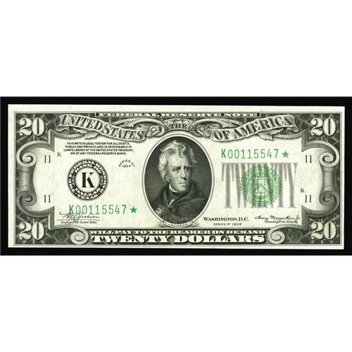 <B>Fr. 2054-K* $20 1934 Mule Federal Reserve Note. Choice Crisp Uncirculated.</B></I><BR>This Dallas Mule Star was lacking from the Taylor Family Collection. This is a nicely preserved note. In fact, it is the highest graded example we have seen.