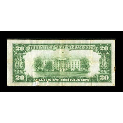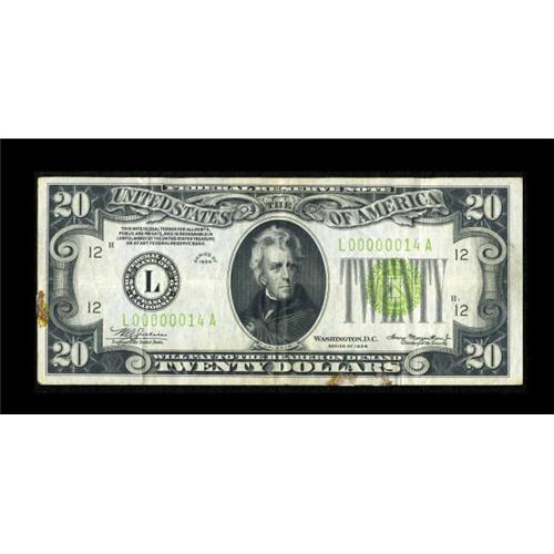 <B>Fr. 2054-L $20 1934 Light Green Seal Federal Reserve Note. Serial Number 14. Very Fine.</B></I><BR> This note now becomes the third lowest serial number reported for this series behind a serial number one from Richmond and a serial number four from New York. A few stains and a skin are noticed as this note may have been on display.<BR><BR><b>Shipping:</b> Coins & Currency (<a target="_blank" href="http://www.heritageauctions.com/common/shipping.php">view shipping information</a>)