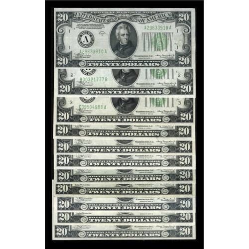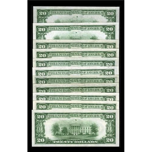 <B>Fr. 2055-A-C; E-L $20 1934A Federal Reserve Notes. Choice Crisp Uncirculated or Better.</B></I><BR> Two notes are below the assigned grade and they are the A note grading <B>AU </B></I>and the I note grading <B>Fine-VF</B></I>.<BR><I>From The Thomas M. Flynn Collection</B></I><BR><BR><b>Shipping:</b> Coins & Currency (<a target="_blank" href="http://www.heritageauctions.com/common/shipping.php">view shipping information</a>)